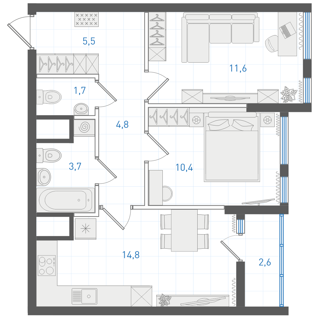Планировка является типовой. Площади помещений, расположение и размеры венткоробов могут меняться в зависимости от этажа. Уточнение проектных данных в офисе продаж.