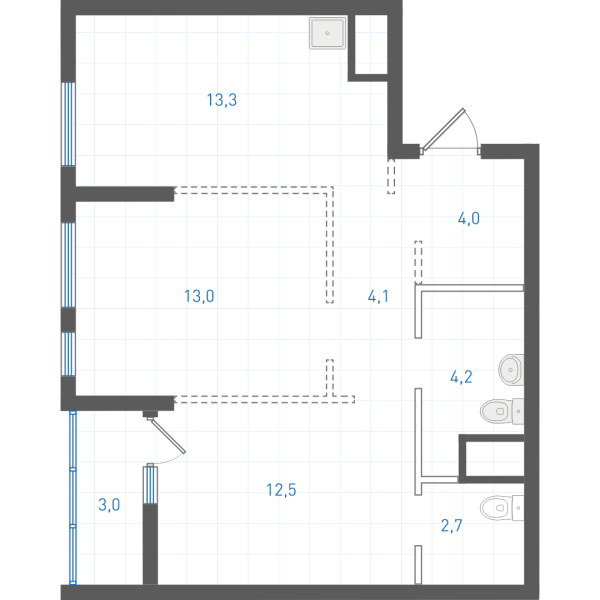 Планировка является типовой. Площади помещений, расположение и размеры венткоробов могут меняться в зависимости от этажа. Уточнение проектных данных в офисе продаж.