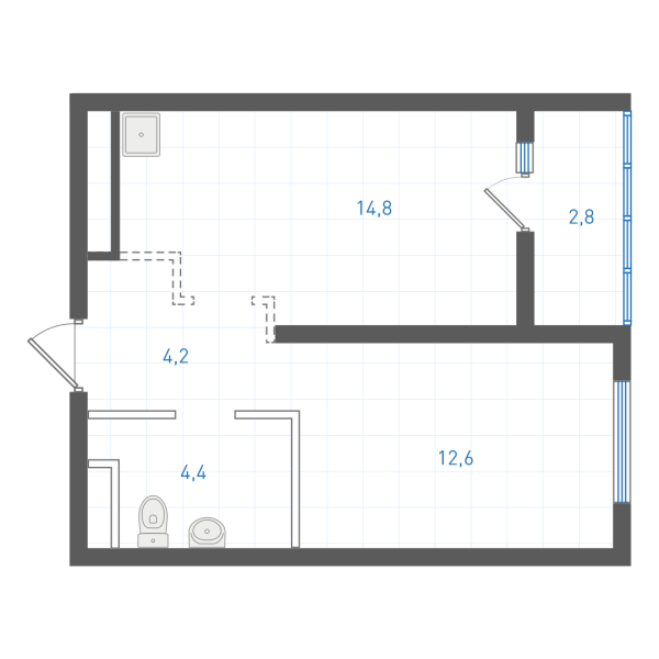 Планировка является типовой. Площади помещений, расположение и размеры венткоробов могут меняться в зависимости от этажа. Уточнение проектных данных в офисе продаж.