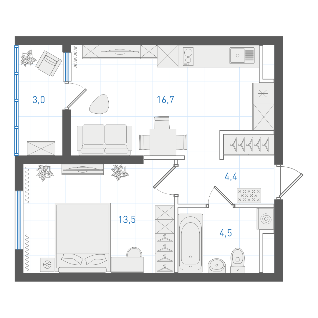 Планировка является типовой. Площади помещений, расположение и размеры венткоробов могут меняться в зависимости от этажа. Уточнение проектных данных в офисе продаж.