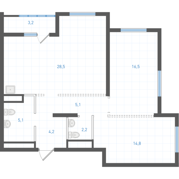 Планировка является типовой. Площади помещений, расположение и размеры венткоробов могут меняться в зависимости от этажа. Уточнение проектных данных в офисе продаж.