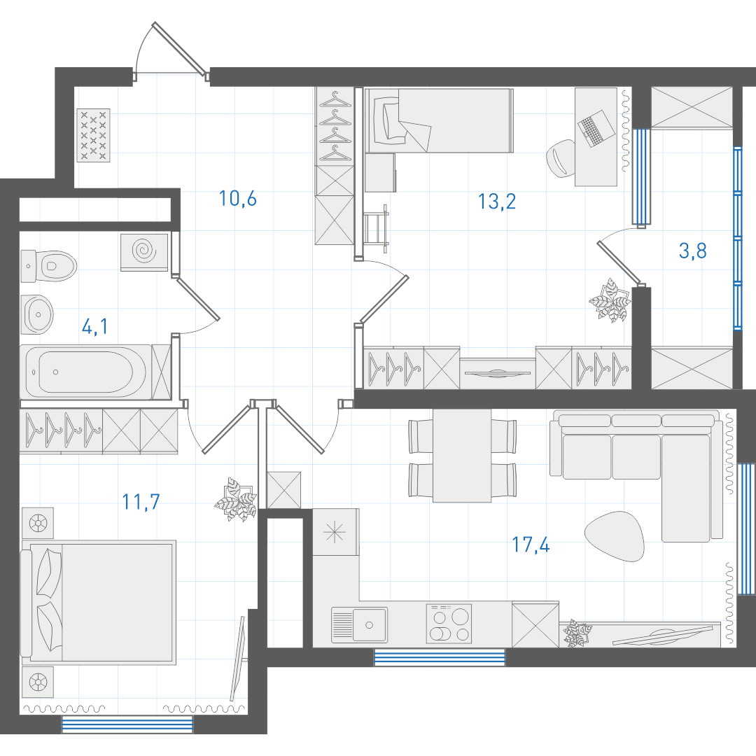 Планировка является типовой. Площади помещений, расположение и размеры венткоробов могут меняться в зависимости от этажа. Уточнение проектных данных в офисе продаж.