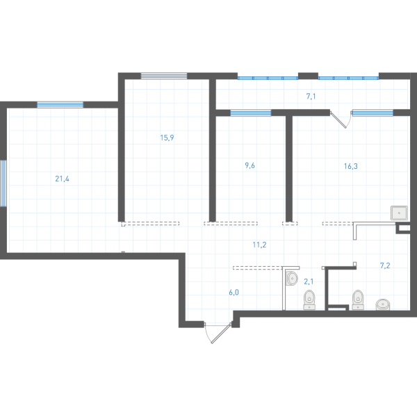 Планировка является типовой. Площади помещений, расположение и размеры венткоробов могут меняться в зависимости от этажа. Уточнение проектных данных в офисе продаж.